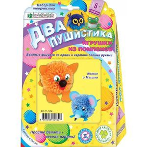 Набор 'Два пушистика. Котик и мышка' научит ребёнка старше 8 лет изготавливать пушистые помпоны из цветной пряжи на шаблонах. Останется только вклеить картонные детали - ушки, носик и лапки, наклеить глазки-самоклейки, помпон-носик и усики из проволоки - и весёлые игрушки оживут!