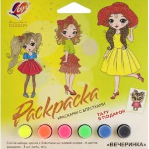 В набор для детского творчества входит 3 карточки с изображением стильных принцесс из плотного картона ( 3 карточки А5 формата), кисть 'Пони' №3 для раскрашивания и яркие флуоресцентные краски на гелевой основе с миллиардами блёсток!