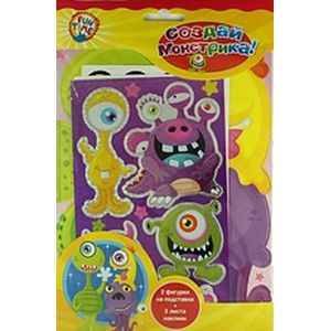 В набор входит все необходимое: основа с двумя монстриками и подставками для них, два листа с переливающимися наклейками виде носов, ртов и глаз и лист с наклейками в виде монстриков.