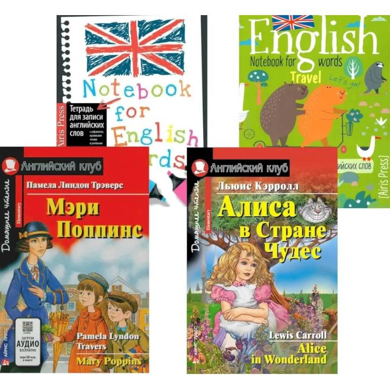 Комплект состоит из двух тетрадей для записи английских слов и двух книг уровня Elementary на английском языке: