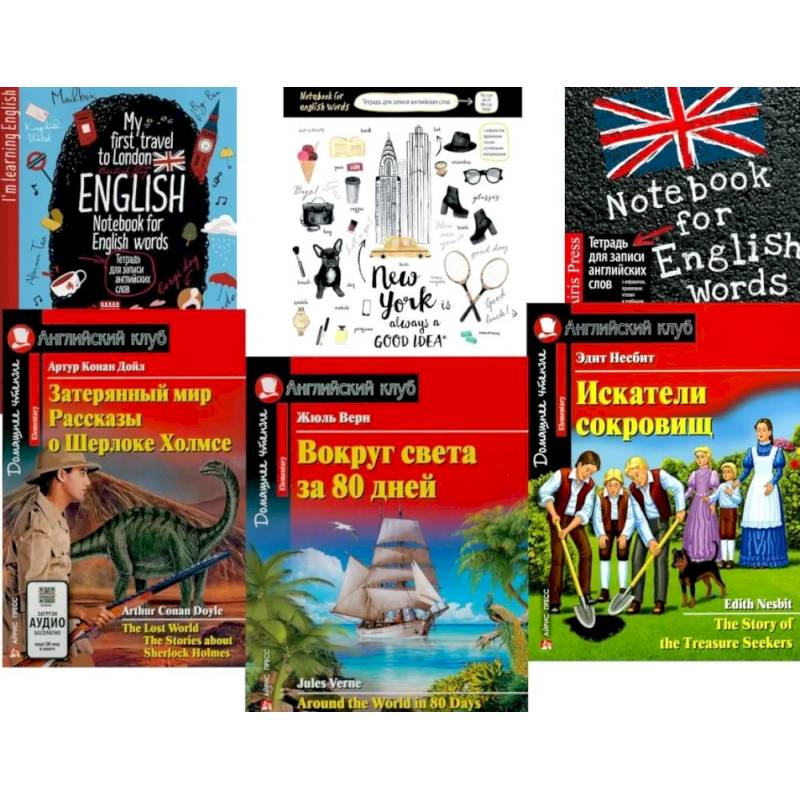 Комплект состоит из трех тетрадей для записи английских слов и трех книг уровня Elementary на английском языке: