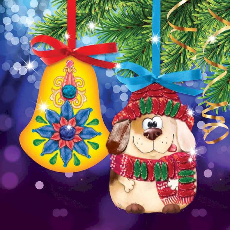 Новогодняя вышивка лентами на елочной подвеске 'Собачка и колокольчик',основа 25x35 см